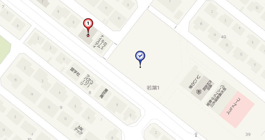 下の地図の青の目印が駐車場で、1番の目印が旧クリニックです。